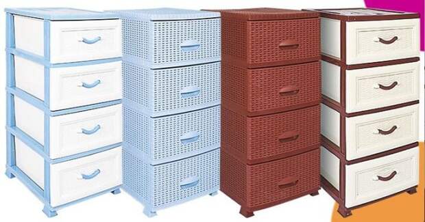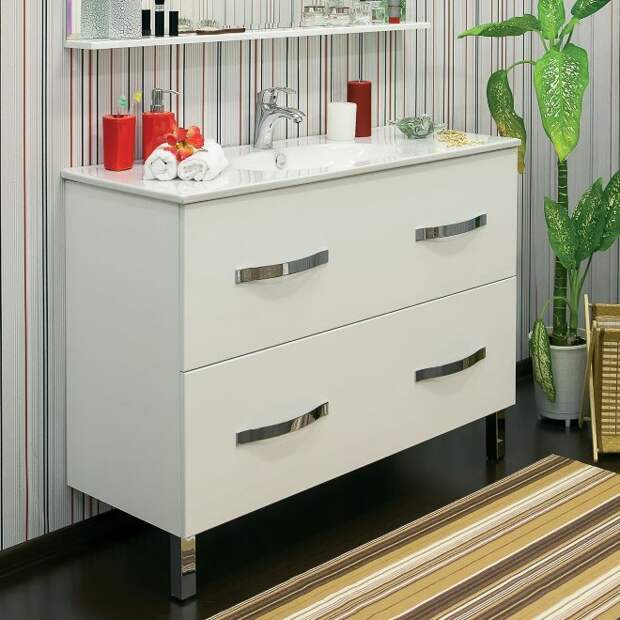 Недорогие комоды создают из пластичного материала, поэтому формы изделий могут быть оригинальными и нестандартными. Такие предметы не «дружат» с дизайном классического стиля. Тумба на колесиках – незаменимая деталь в ванной комнате, ее можно поставить в угол и при необходимости выкатывать в центр комнаты. Несложно подобрать изделие любой расцветки. Красные или синие комоды ярко украсят белоснежные ванные комнаты.