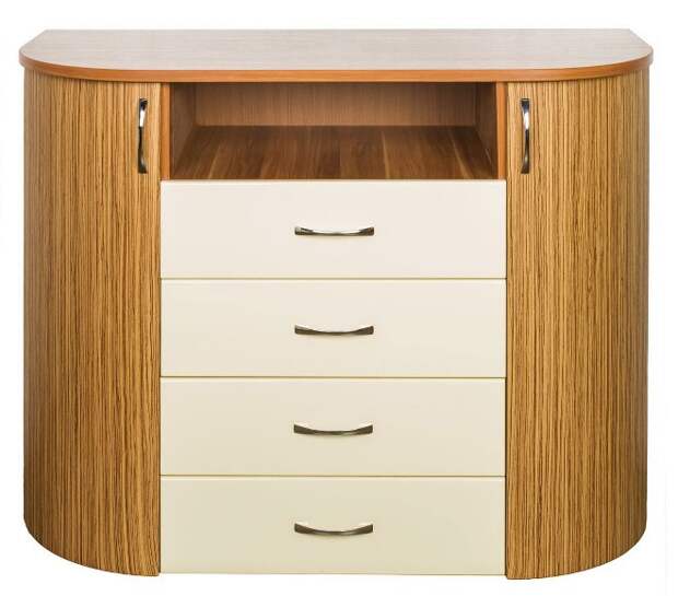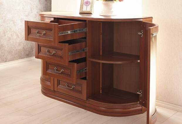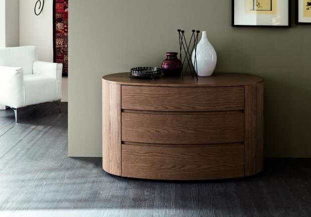 Комоды с выпуклыми фасадами смотрятся нестандартно. Форма изделий не уменьшает их функциональности, но стоить они могут дороже традиционных прямоугольных аналогов.