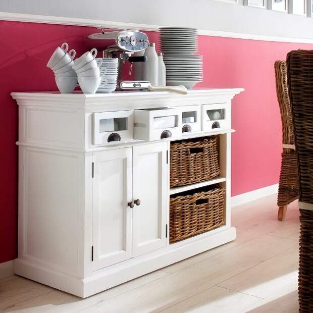 На кухне мебель используется преимущественно для хранения посуды, мелкой бытовой техники и может иметь вид высокого пенала с закрытыми ящиками, открытыми полками или традиционной небольшой тумбы. Помимо ящиков, комоды для кухни могут иметь распашные дверцы. На открытых полках расставляют вазочки, декоративные подсвечники, цветки.