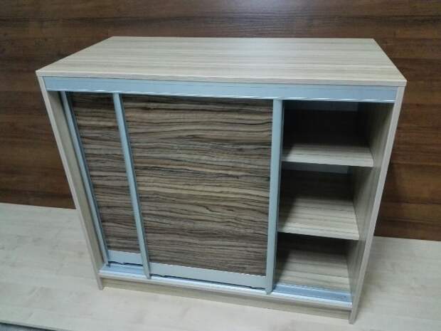 Подобные изделия визуально напоминают шкаф-купе в миниатюре. Раздвижные дверцы позволят комфортно пользоваться мебелью, установленной в узкой прихожей или компактном помещении. Внутри есть только полочки. Дверные полотна делают из матового стекла или дерева.