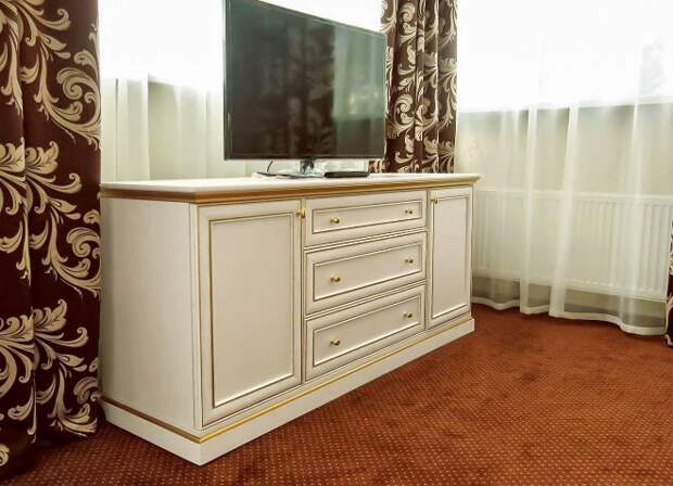 - выполняет роль надежной телевизионной подставки. Последние модели мебели позволяют встраивать ТВ. Управлять движением экраном можно при помощи пульта.
