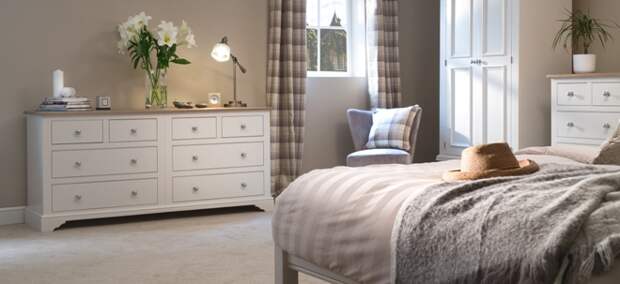 Белый комод в интерьере спальни – идеальный вариант, поскольку комната отдыха обычно имеет скромные размеры, и светлая мебель будет малозаметна. Обстановку кабинета или рабочего уголка элегантно украсит комод оттенка красного дерева или брашированное изделие.