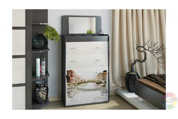 Это универсальная мебель для малогабаритного помещения. По заказу, комоды с зеркалом могут оснащаться обувной системой хранения, выдвижными ящиками. Удобнее всего в маленький коридор ставить комод-купе с зеркальными дверными полотнами.