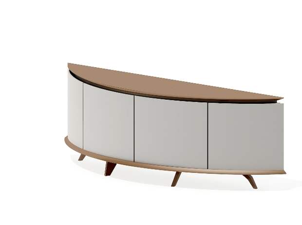 - полукруглый образован пятигранным основанием и скругленной столешницей, за которой удобно сидеть. В центральной части тумбы располагают выдвижные ящики, а сбоку – открытые полочки.