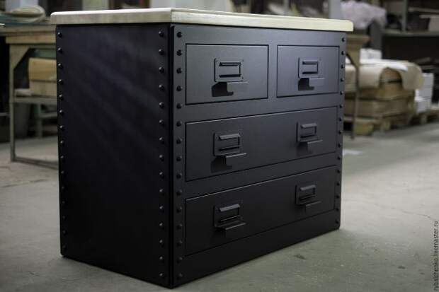 Такие изделия с коваными основаниями смотрятся довольно своеобразно. Деревянные элементы смягчают суровый вид мебели. Сочетание деталей разного цвета (черное кованое основание и белый корпус с ящиками) повышает декоративность моделей. Такие комоды органично впишутся в интерьеры, выдержанные в деревенском стиле или лофт.