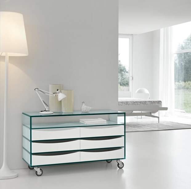 Подобные роскошные изделия придадут обстановке респектабельности. Идеально подходят для гостиной, прихожей, спальни. Отражающая поверхность дверных полотен оригинально сочетается с деревянными и каменными поверхностями. Стеклянные тумбы органично комбинируются с барными стойками, невесомыми стеллажами, прозрачными навесными полками. Цветные стеклянные вставки эффектно смотрятся на фоне белой мебели.