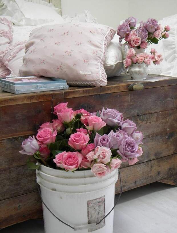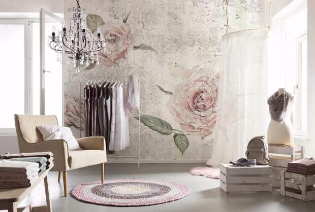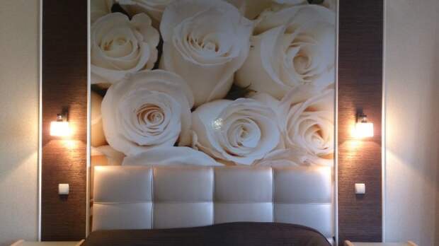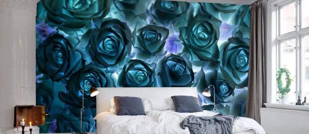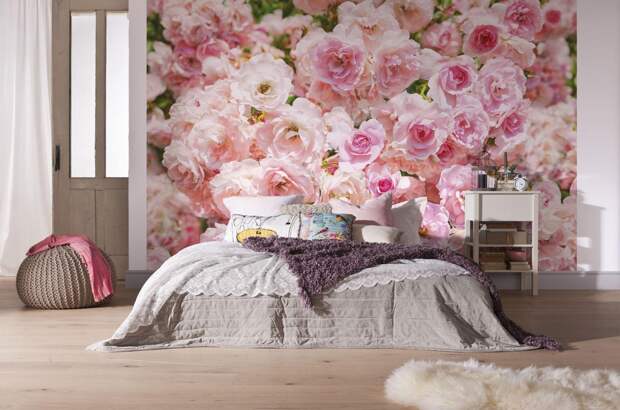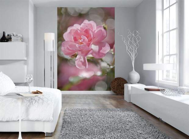 Разместить на одной стене изображение нежных чайных роз, выполненных в светлых оттенках или розовом цвете, можно в комнате, где живет девочка. Если при этом остальные поверхности сделать монохромными, то такая комбинация будет смотреться очень стильно и современно.
