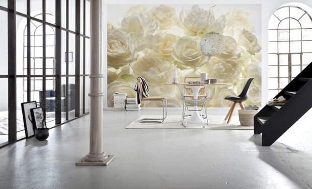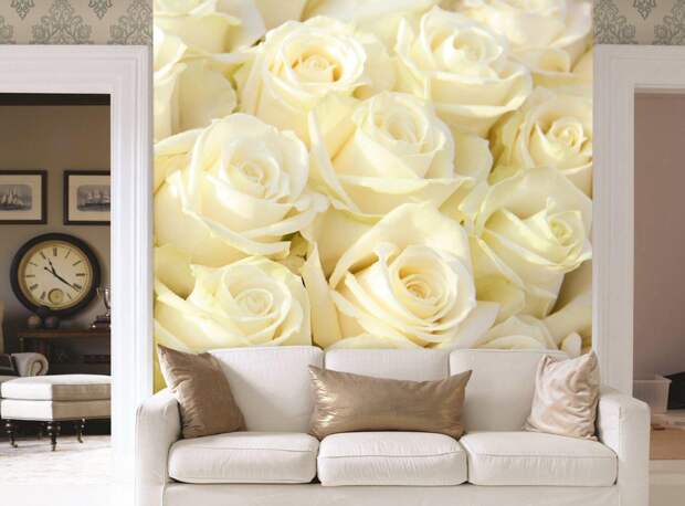 Белые бутоны привнесут в комнату легкие свежие нотки невесомости и чистоты. Наиболее органично розы будут смотреться в интерьере спальни, располагая к отдыху и релаксации. Для ванной комнаты можно выбрать плитку, где будут изображены цветки с каплями росы. Рельефные тисненые обои органично впишутся в дизайн зала, а на кухне красиво будет смотреться композиция из большого количества мелких белых цветков.