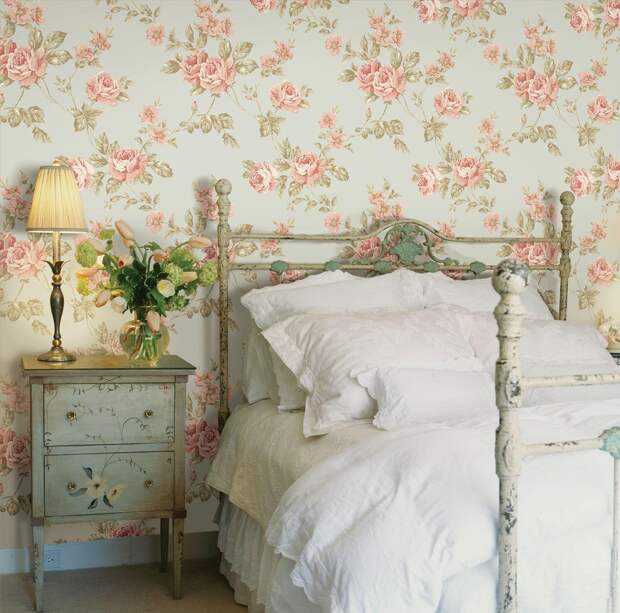 Идеальным решением для спальни станут обои с мелкими розами. Выбор такого принта особенно актуален, когда размеры комнаты невелики. Нежная и неброская цветовая гамма прекрасно впишется в общее настроение, а вот от темных тонов здесь лучше отказаться. Органично будет смотреться в таком пространстве и цветочная композиция в стиле прованс и шебби-шик. Красиво мелкие розы будут выглядеть на белом и любом другом светлом фоне. Не менее гармонично будут смотреться цветы и в классическом варианте интерьера.