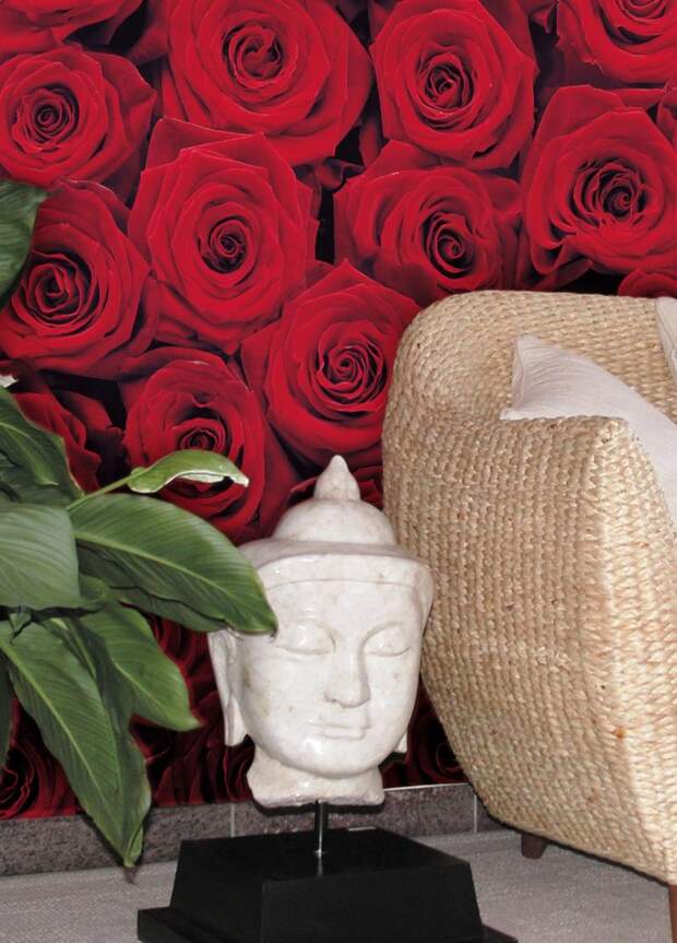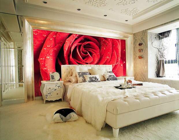 Использовать красные розы актуально в интерьере гостиной, реже — спальни. Во втором случае (при умелом использовании) они создадут романтическую атмосферу. Оранжевый цвет прекрасно поднимает аппетит, поэтому изобразить яркие цветы можно на кухне. Если в комнате достаточно темно, то желтый цвет сделает ее светлее.