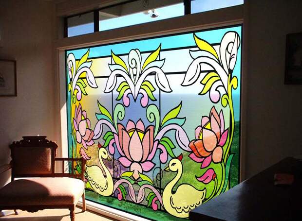 На нижних этажах и в частных домах окна декорируются витражами или наклейками. Если все же нужны шторы, то подбираются изделия из легких тканей, которые не препятствуют поступлению солнечного света.