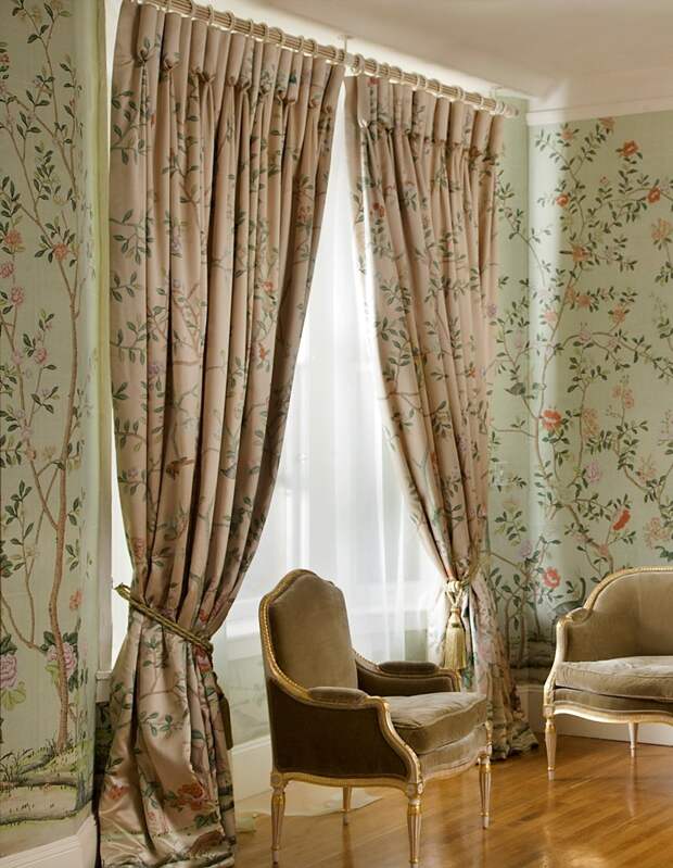 Смотрятся они дорого и роскошно. Для создания подобных изделий используются легкие благородные ткани: муслин, шелк, тюль, атлас и другие. Французские шторы подходят для классического, винтажного и богемного направления, гармонично будут выглядеть в просторных комнатах.