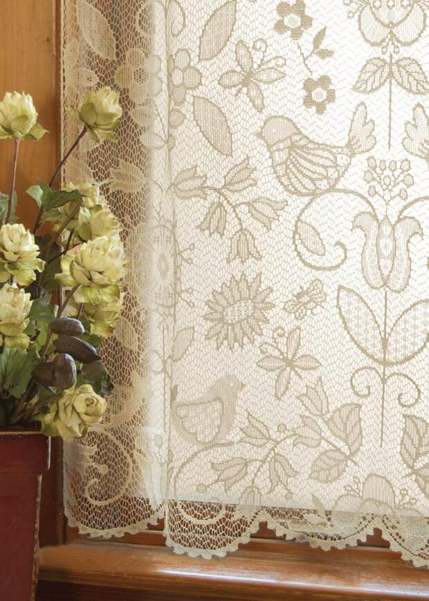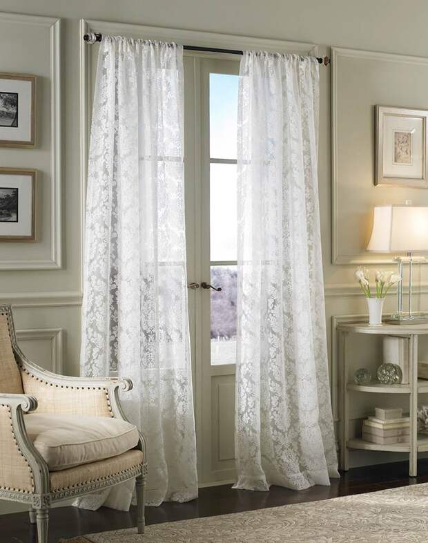 Кружевные портьеры с изящными рисунками вновь в моде. Воздушные полотна привносят мягкость и нежность в помещение, используются в интерьере кухонь, гостиных, спален. Кружевом можно задекорировать комнату в средиземноморском стиле или прованс.