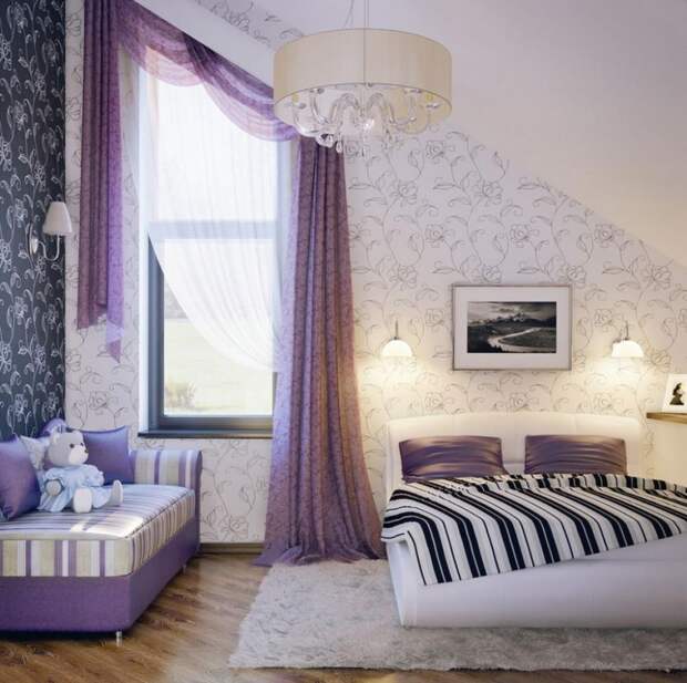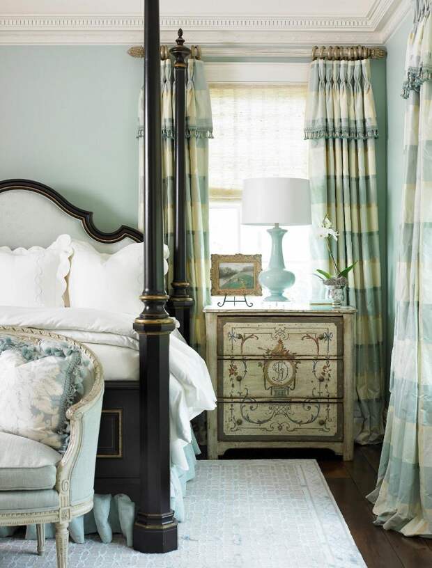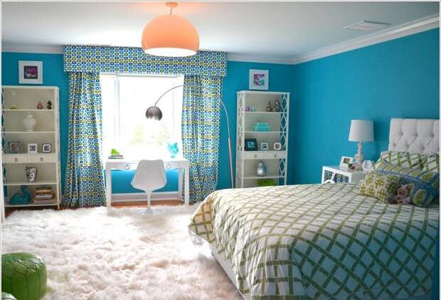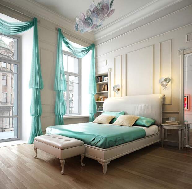 В спальне используются нейтральные оттенки: бирюзовый, голубой, кремовый, бежевый, салатный. Если не хватает ярких красок, достаточно задекорировать оконный блок оранжевыми, желтыми, фиолетовыми шторами. Гармонично выглядят занавески и постельное белье с одинаковыми принтами.