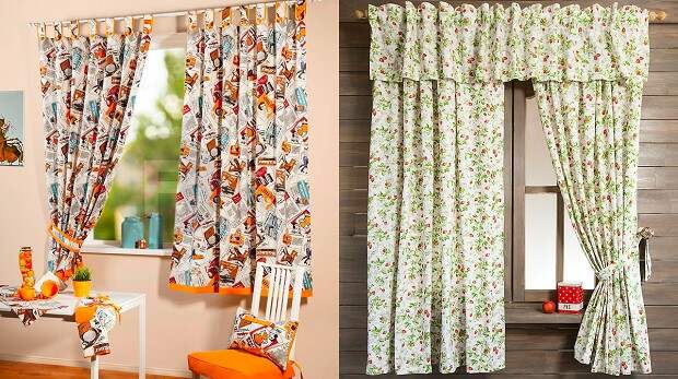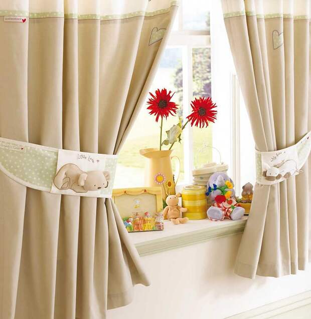 Идеи декора окна в гостиной не обходятся без ярких красок. Это же правило актуально для детской. Ребенок будет комфортно себя чувствовать, если на шторах присутствуют бабочки, звезды, роботы, божьи коровки и другие картинки.