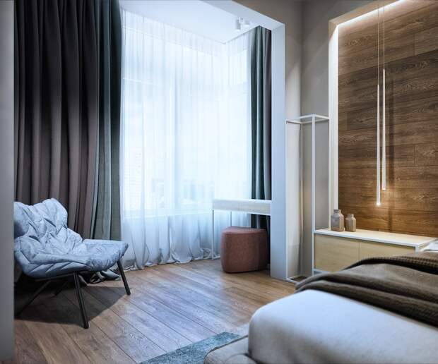 Отлично сочетаются друг с другом ткани с плотной и воздушной текстурой. Такой тандем выглядит привлекательно, а также позволяет регулировать уровень освещения комнаты в разное время суток.