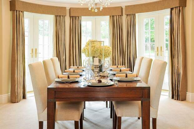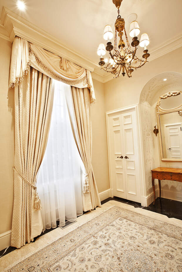 Изделия гармонично выглядят в классических интерьерах. При длине ниже подоконника занавеска будет полностью прикрывать окно, а внизу сформируются роскошные фестоны.