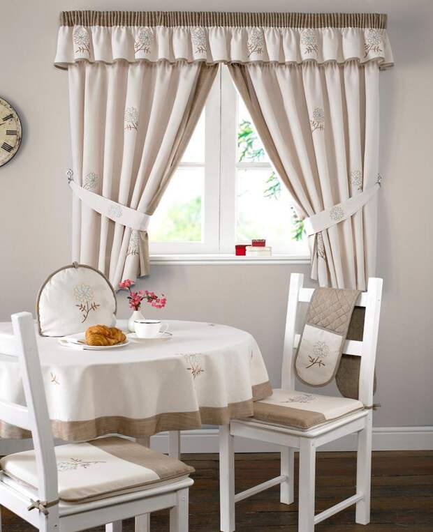 В моде многослойность занавесок, использование всевозможных украшений в виде оригинальных бантов, кистей, держателей. Среди принтов первое место занимают флористические орнаменты. Актуально использование рюшей в качестве окантовки. Это может быть тесьма, кружево, атласные ленты или бахрома.