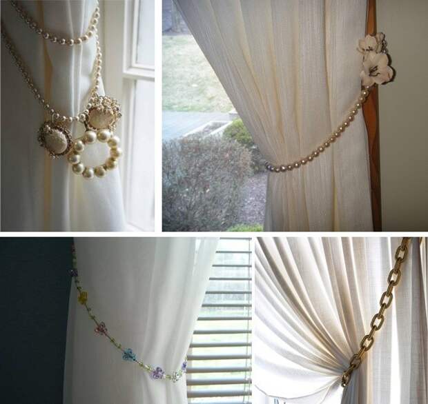 Роль подхватов играют ленты, кусочки ткани, бусы, различные шнуры. Декоративные элементы дополнительно украшаются бахромой, ракушками, вышивкой, пайетками. В детской допустимо применять заклепки в виде сказочных персонажей или небольших игрушек.