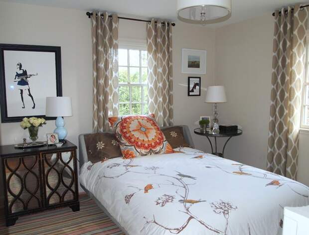 В спальне используются нейтральные оттенки: бирюзовый, голубой, кремовый, бежевый, салатный. Если не хватает ярких красок, достаточно задекорировать оконный блок оранжевыми, желтыми, фиолетовыми шторами. Гармонично выглядят занавески и постельное белье с одинаковыми принтами.