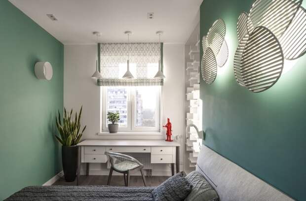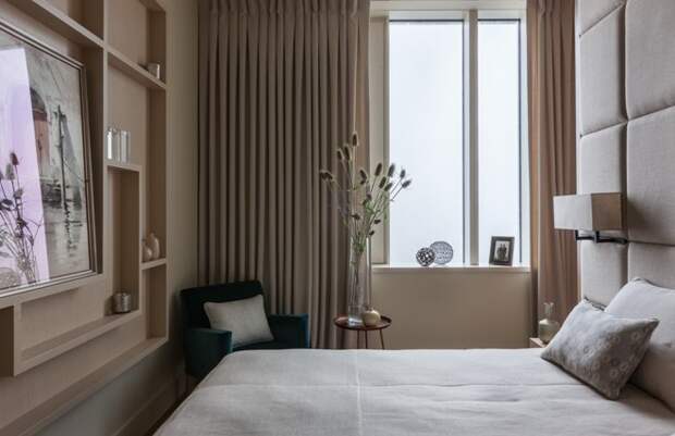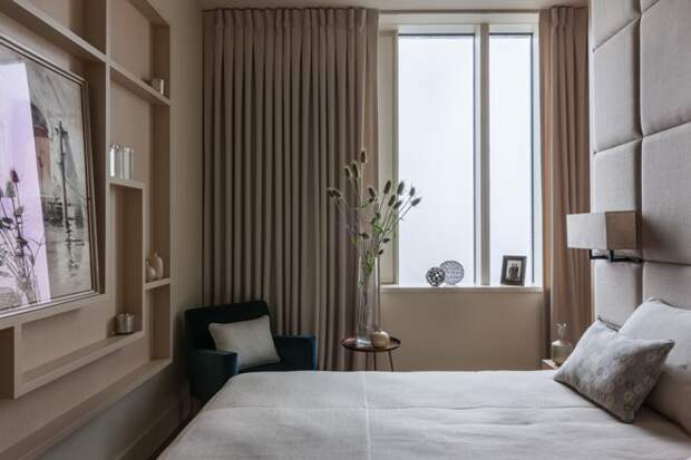 Интерьер узкой спальни с одним окном оформить сложнее, но все же и у него есть свой плюс —подоконник. В маленькой комнате его можно использовать в качестве места для хранения или небольшого рабочего стола, на который ставят компьютер или ноутбук.