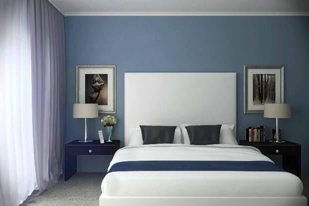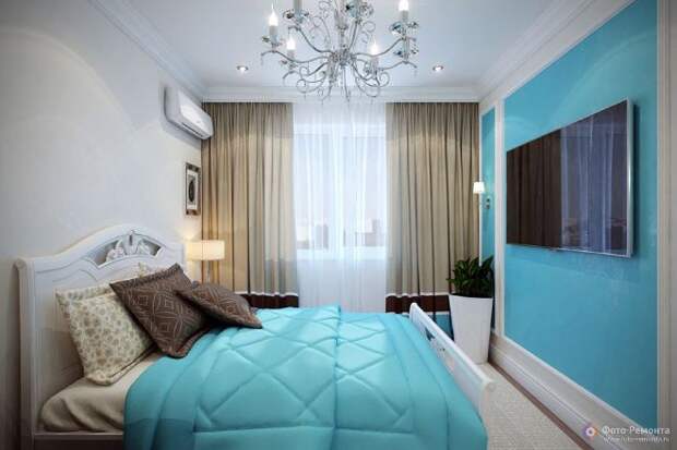 - Один тон плюс акцент. Это комбинирование считается классическим. Основной оттенок может быть любым (например, нежно-голубым, белым, светло-желтым или персиковым). Акцент должен сочетаться с ним. Им будут выделяться детали интерьера (к примеру, ковер, покрывало на кровати, занавески или висящая на стене картина).