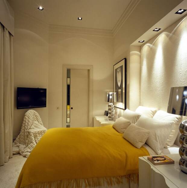 Свет должен быть обильным, но при этом теплым и рассеянным. Иначе спальня будет похожа скорее на хирургический кабинет, чем на место, где можно расслабиться после тяжелого дня.