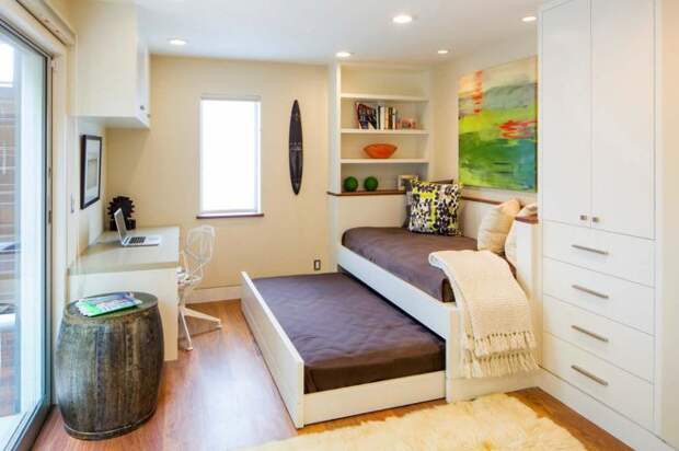 - в том случае, когда в комнату умещается только кровать, местом хранения можно сделать не полки, а ящики, установленные под ней.