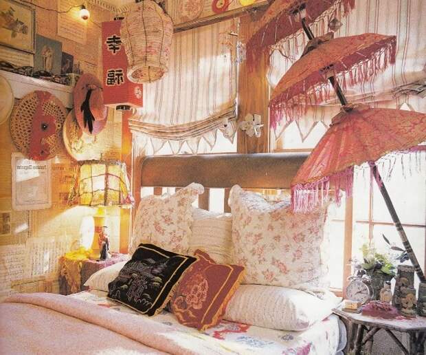 - Бохо. Необычный стиль, пришедший от цыган. Очень хорошо подходит для маленькой спальни. Цвета — яркие, но не обязательно сочетающиеся (лучше придерживаться относительно сдержанной палитры зеленого и коричневого), много текстиля (покрывало, ковер, занавески). Необходимо множество аксессуаров — ловец снов, свисающий с потолка, мягкое кресло-мешок, подушки на кровати, фото в затейливых рамках на стенах, ароматические палочки в вазе. Здесь все должно говорить об уюте. Не подойдет перфекционистам.
