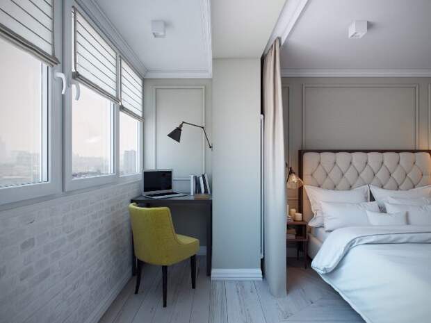 Если в спальне есть балкон или лоджия, её хозяин может считать себя баловнем судьбы — это же несколько метров полезной площади, которые можно использовать во благо. Самые распространенные варианты: