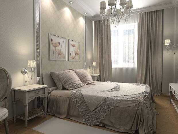 - Прованс. Французская классика. Цвета — светлые, теплые. Потолки надо побелить, на стены поклеить обои с цветочками, на пол положить ламинат или паркет. Обязателен текстиль — ковер, покрывало. Важны кованые элементы — затейливая железная спинка у кровати или изогнутые ножки у кресла. На окнах — легкие шторы из тюля, приветствуется букетик цветов в вазе. На стену можно повесить пейзажи Франции или фотографии любимых людей.