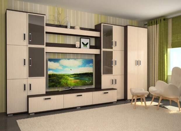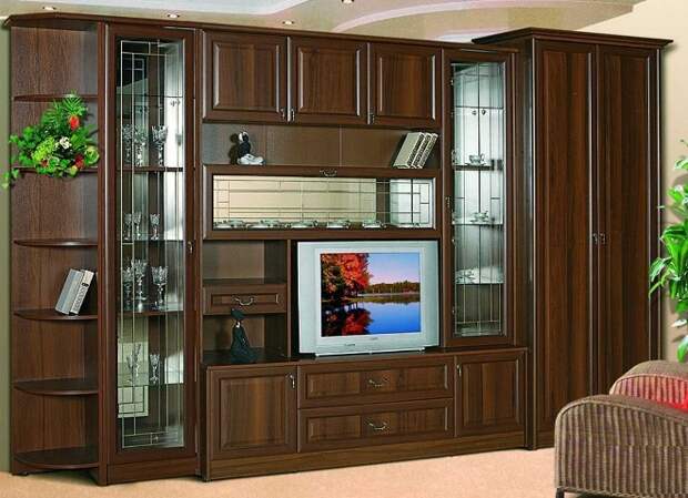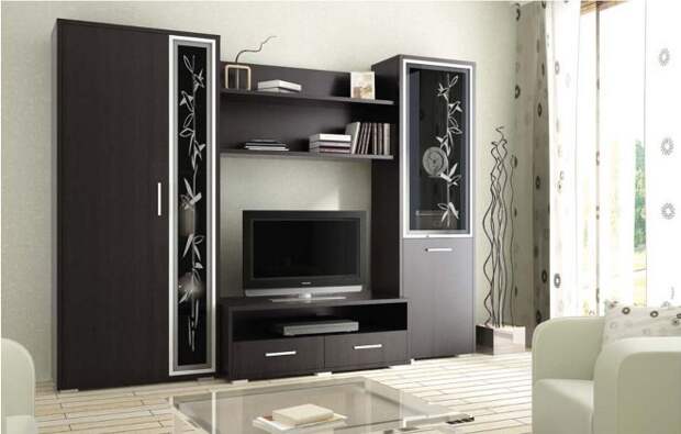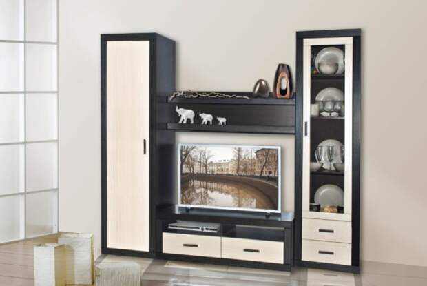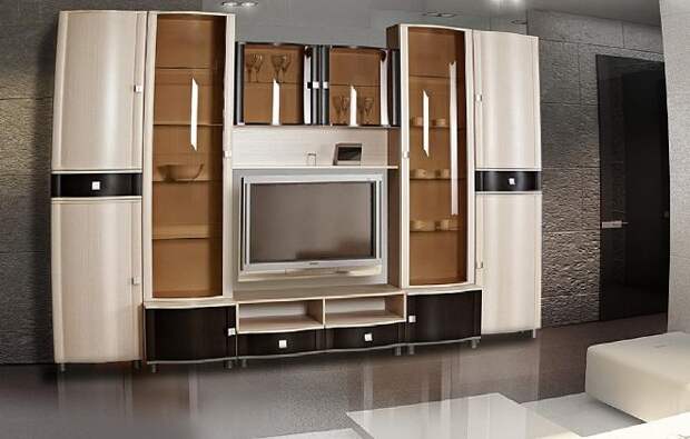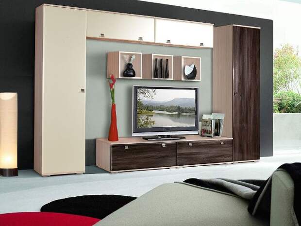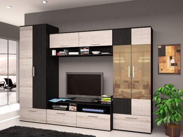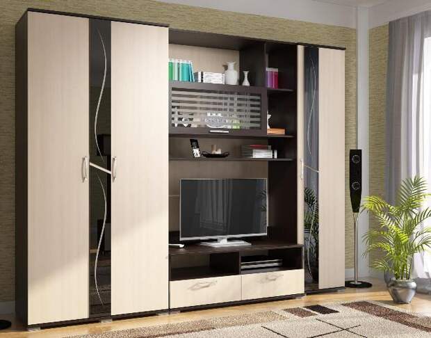 - стенка-шкаф напоминает модернизированный шкаф-купе, центральное место которого отводится для установки телевизора.