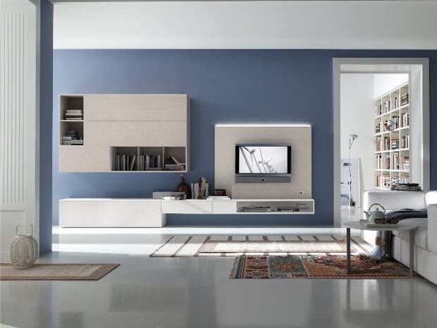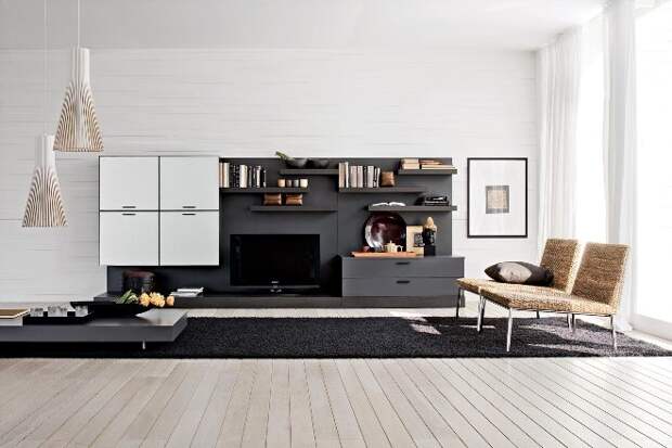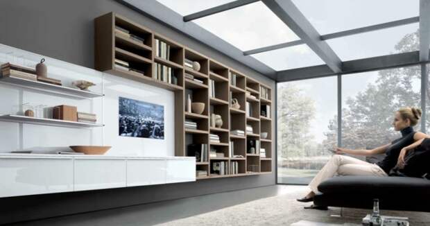 Стенка, оборудованная большим количеством полок, идеальна в просторных гостиных, решает проблему нагромождения предметов. Как правило, это модульная система. Подобные конструкции смотрятся на своем месте в современных интерьерах. Лаконичная мебель собирается из ДСП, МДФ и бывает как ярких, так и нейтральных оттенков.