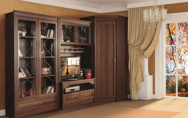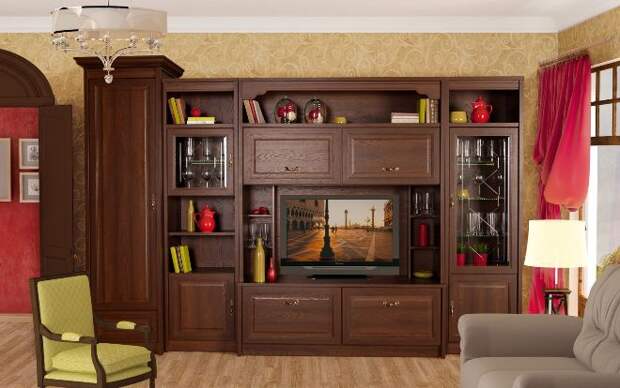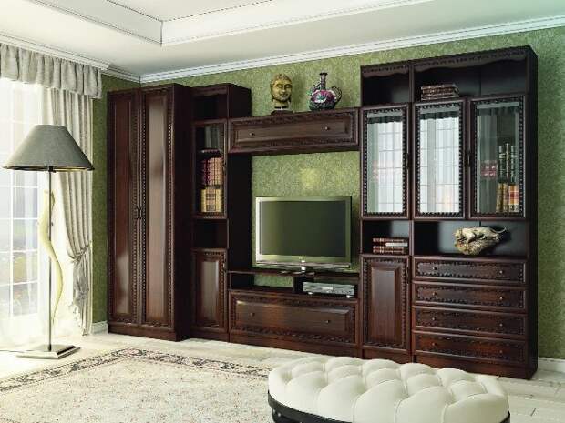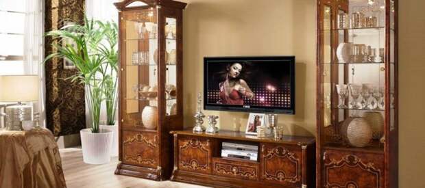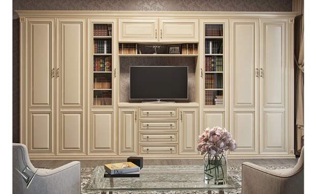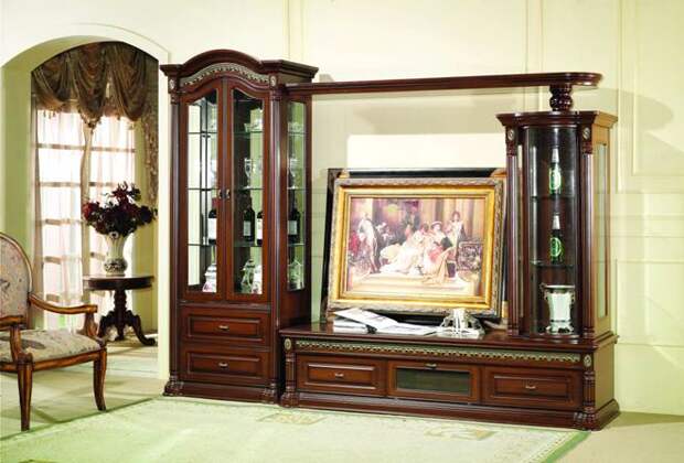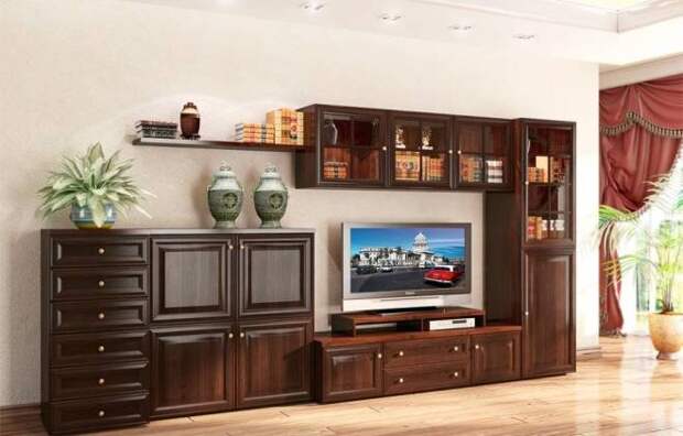 В гостиных классического стиля всегда найдется место для книг. Стеллажи или узкие книжные шкафы помещают в ниши (пол застилают ламинатом). Чтобы элегантно разместить телевизор, подбирают невысокую стенку со стеклянными шкафами, симметрично расположенными от центра.