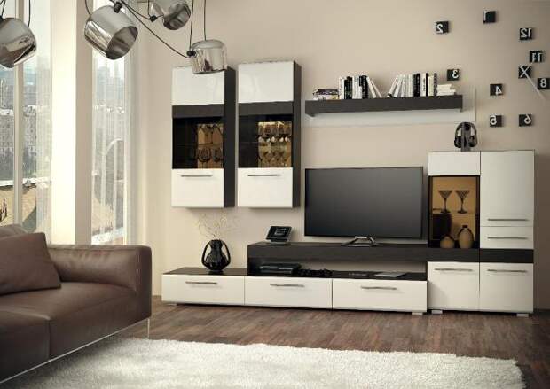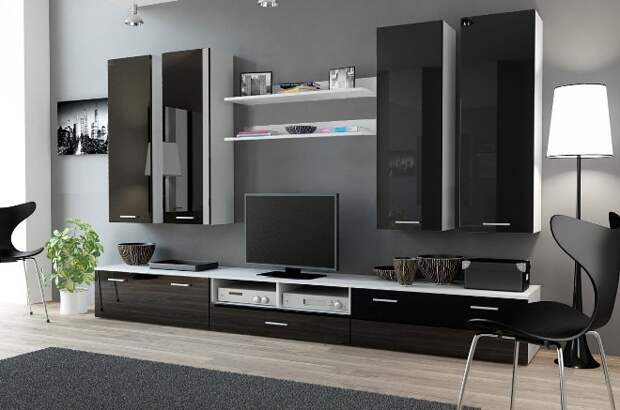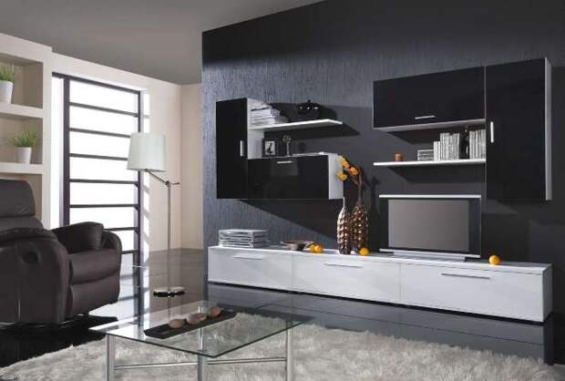 Обычно в интерьере используют 3-4 оттенка из скромной палитры: черный, белый, серый, коричневый, серебристый. Проще всего подобрать стенку с глянцевыми фасадами под основной цвет обстановки. Еще беспроигрышным вариантом будут гарнитуры белого, светло-серого тонов.