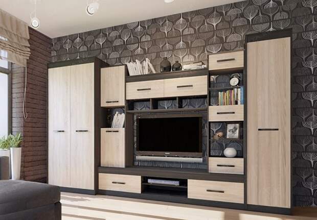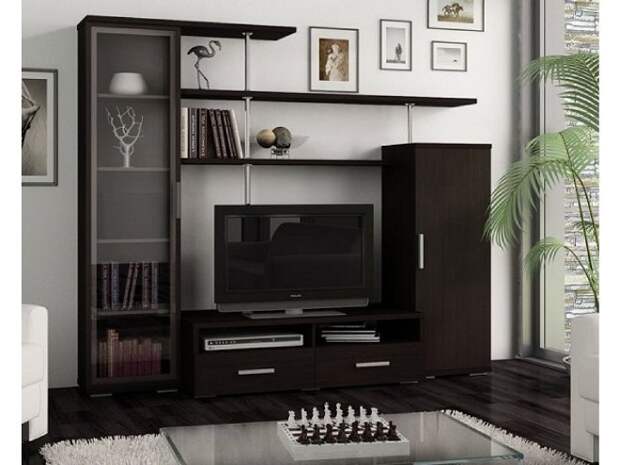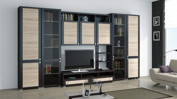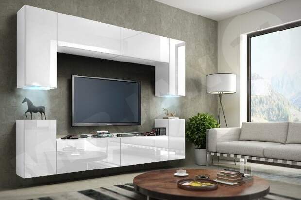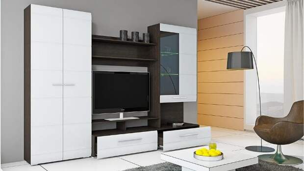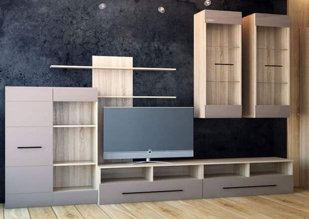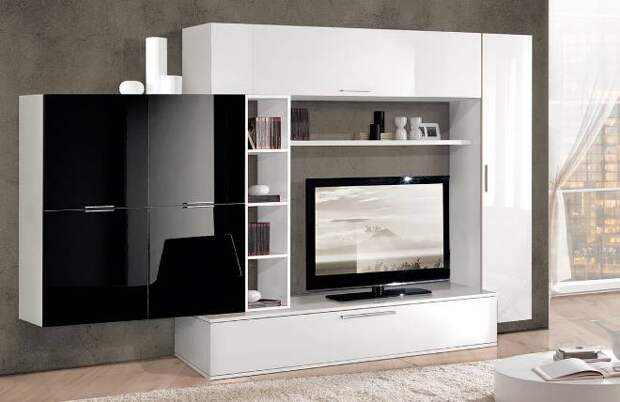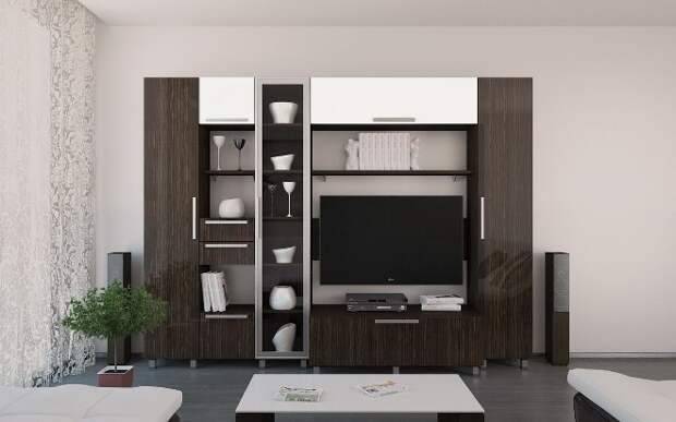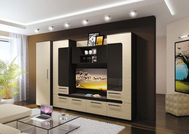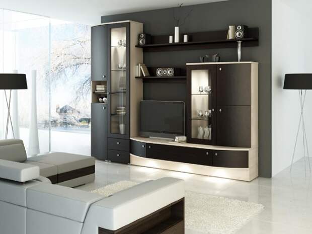 Современные стенки великолепно подходят для размещения телевизора, домашнего кинотеатра и отличаются функциональностью, стильным дизайном. Исходя из конструкций, можно условно выделить несколько видов мебели: