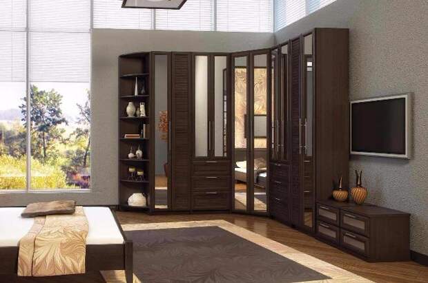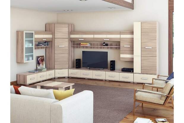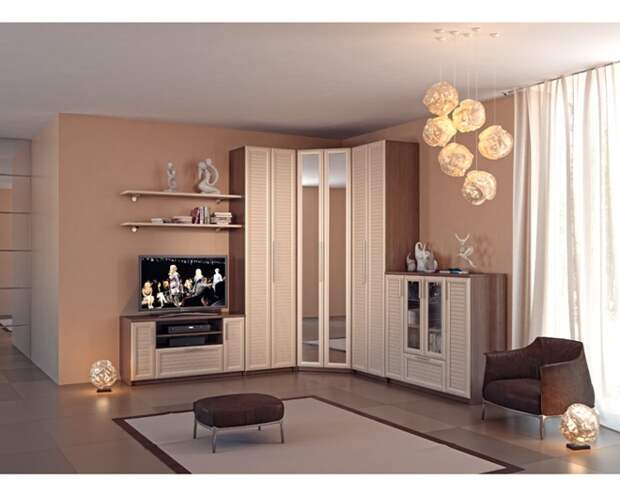 Подобные конструкции мебели весьма популярны, поскольку позволяют задействовать «мертвую» угловую зону, предоставляют много вариантов расстановки модулей, могут выполнять роль перегородки.
