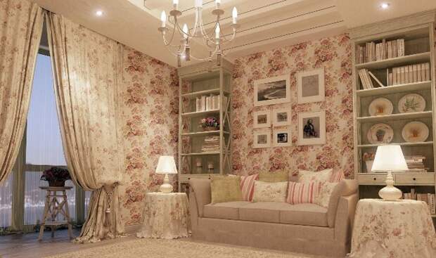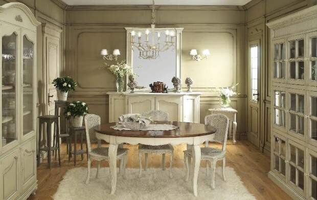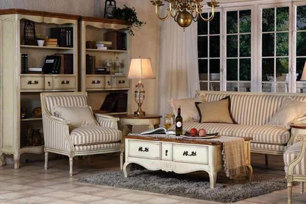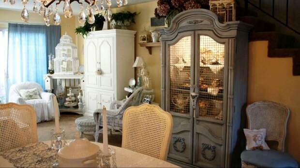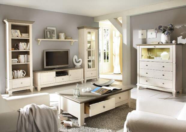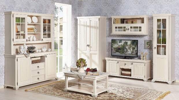 Если не удалось достать старинную мебель для уютной гостиной в прованском стиле, то не стоит расстраиваться. Вполне подойдет современный гарнитур, для декорирования которого использовались резьба, патина, легкая позолота, металлическая фурнитура. Серванты украшает декупаж, росписи с цветками, растительными орнаментами.
