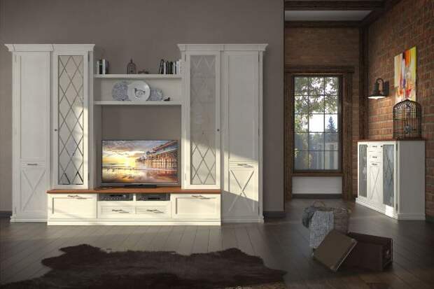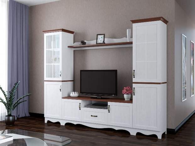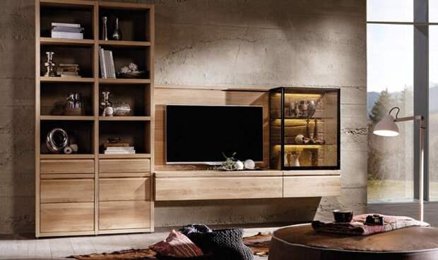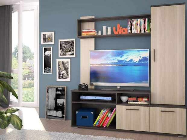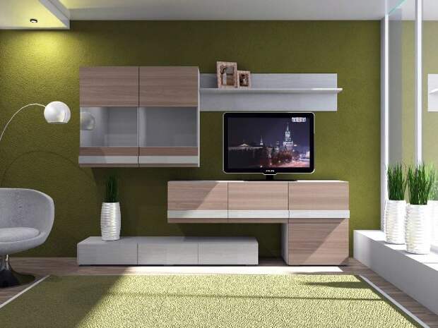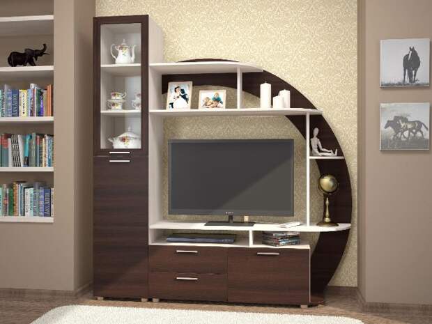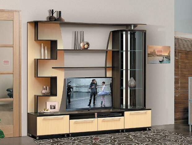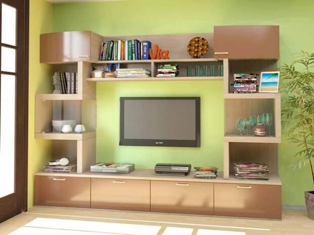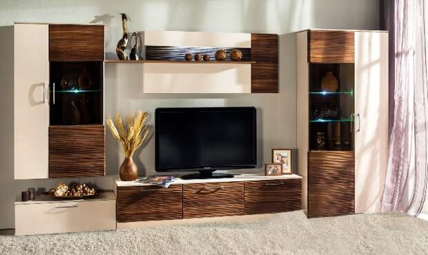 Чтобы изобразить некоторое подобие гарнитура, можно поставить телевизор на узкую невысокую тумбу на ножках, по бокам уставить одинаковые неглубокие шкафы со стеклянными дверцами или открытыми полками. Уютно будет смотреться как мебель светлых оттенков, так и коричневых.