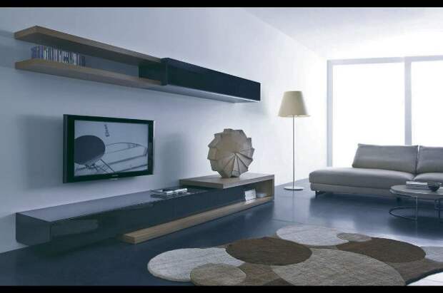 Естественно, для гостиной подбирается мебель соответственно стилю интерьера. Важно также подбирать конструкции, которые позволят искусно скрывать провода, чтобы не нарушать эстетичный вид помещения.