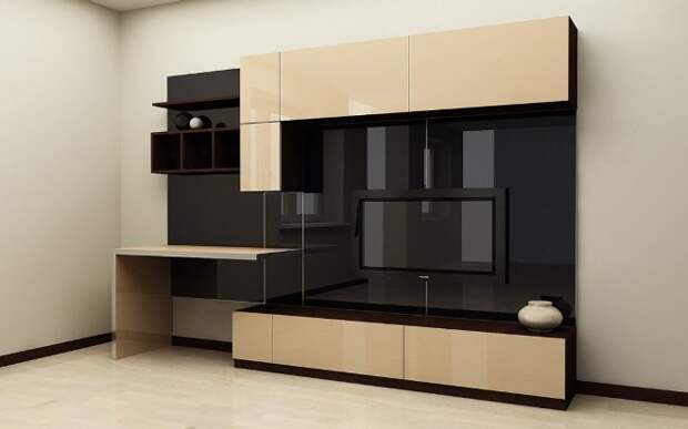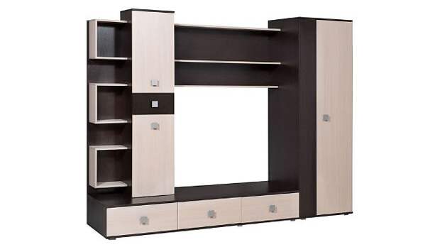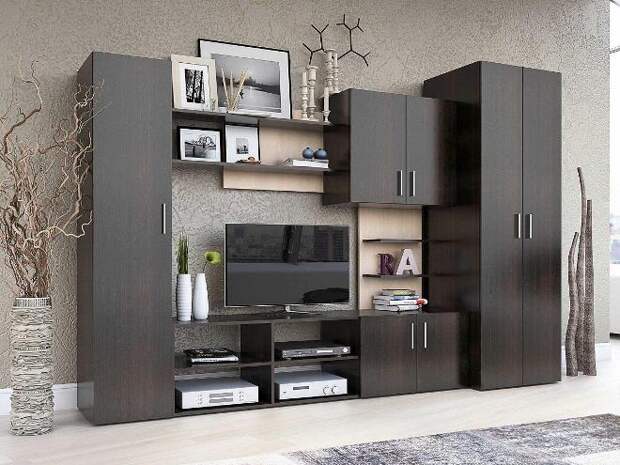 Наиболее удобный вариант для маленького помещения: 1/3 часть конструкции с декоративными полочками располагают у стены с оконным или дверным проемом, а большая часть занимает пустую стену. Причем угловой сегмент может быть представлен платяным шкафом. На большей стороне обычно есть шкафы с закрытыми дверцами, выдвижной письменный стол, подставка, где размещают телевизор.