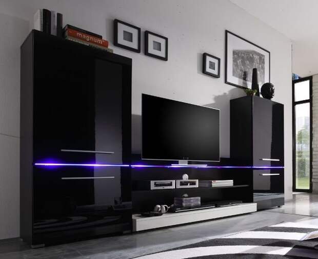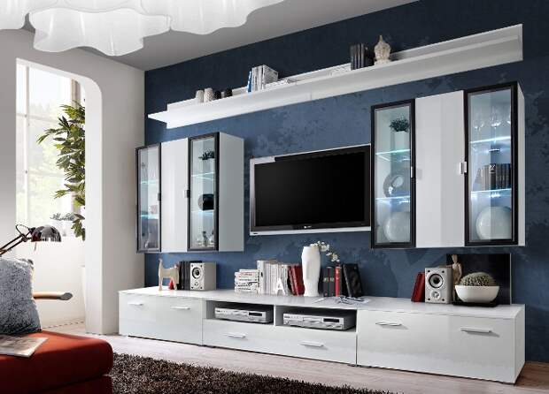 В первую очередь стенки должны быть практичными, однако декоративная составляющая играет большое значение для дизайна гостиной. Модный тренд – светодиодная подсветка, зафиксированная снизу подвесных модулей и придающая им воздушный, невесомый вид. Подобное украшение мебели уместно в современных интерьерах (минимализм, хай-тек).