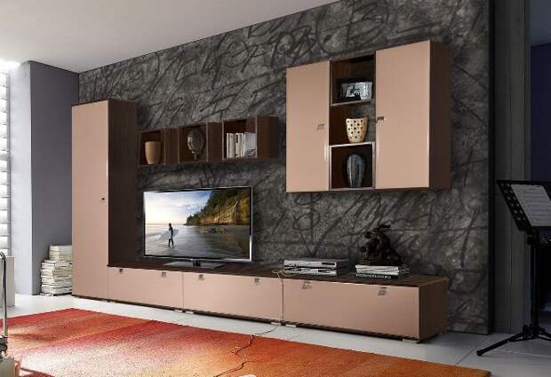 - стенки-тумбы предполагают установку техники на вытянутой невысокой тумбе, в центре конструкции. Подвесные шкафчики располагаются в произвольном порядке;