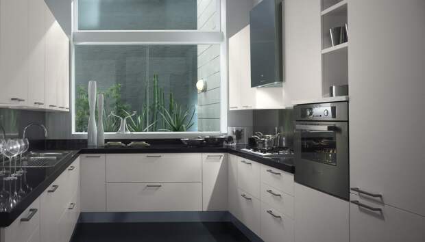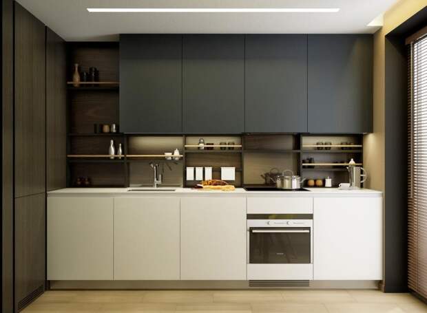 - в прямоугольных узких помещениях гарнитур обычно располагают вдоль одной стены. Зонирование пространства – распространенный вариант визуальной коррекции формы кухни;
