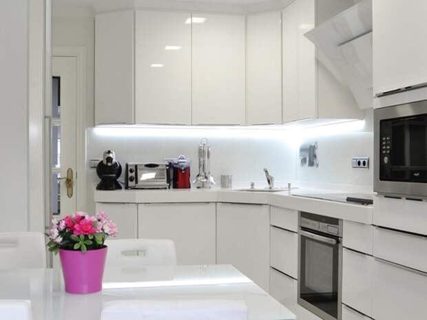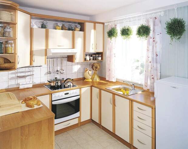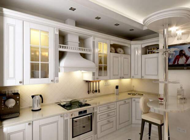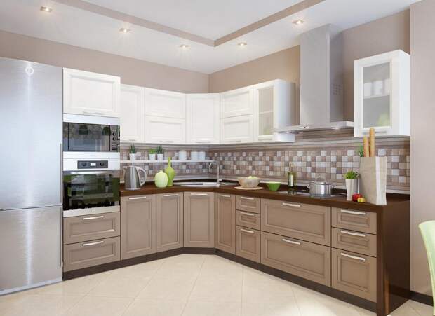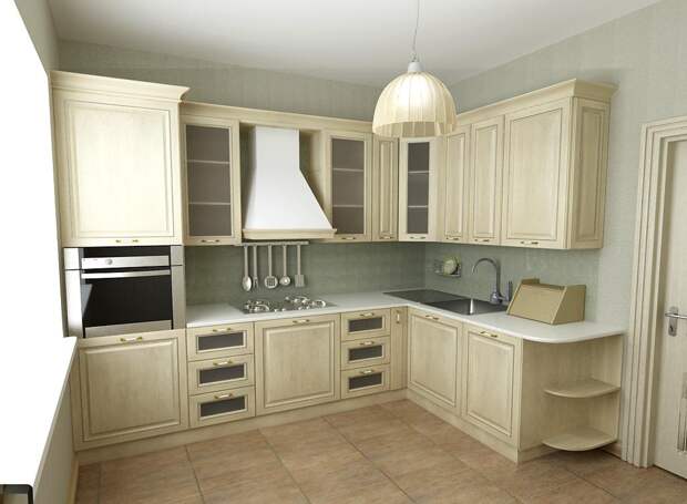 - угловая – самая популярная и распространенная планировка. Именно таким образом рекомендуется расставлять мебель и технику, поскольку несложно спланировать функциональный рабочий треугольник (плита-мойка-холодильник).
