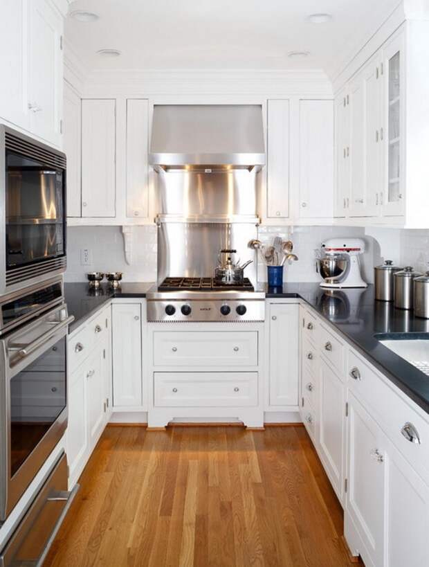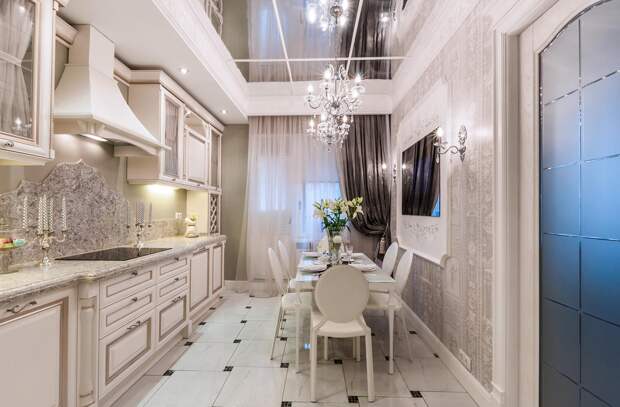 - параллельная планировка подойдет для кухни шириной не менее 2,3-2,5 м. Иначе будет сложно открывать дверцы или перемещаться. Отличная идея – установить вдоль одной стены меньше элементов кухонного гарнитура, чтобы на свободных м2 обустроить столовую зону;