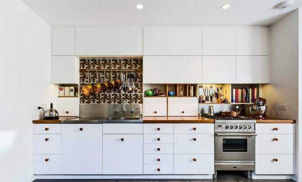 Поэтому, если кухня 13 кв. м имеет чисто номинальное значение, приветствуется минимализм: обеденная группа/одна барная стойка, рабочая зона с техникой. Ценителям изысканных блюд и любителям готовить понадобится полная компоновка: всевозможные полки, шкафы для хранения кухонной утвари и техники. Актуальный тренд – минимум ящиков с максимальной вместительностью.