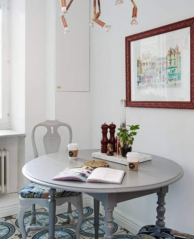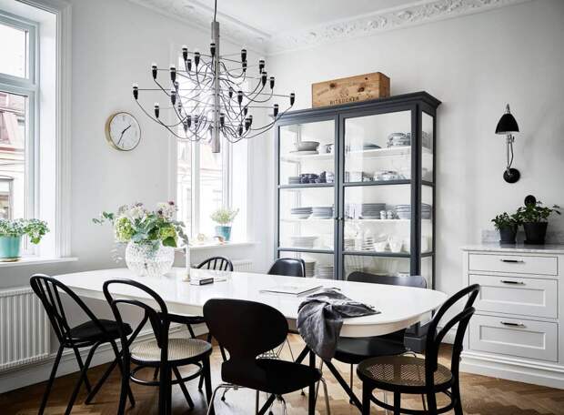 Популярность интерьеров в скандинавском стиле не уменьшается. Отличительные черты лаконичного дизайна – естественные светлые тона, натуральные материалы, функциональная мебель простых форм. Древесина – самый распространенный отделочный материал. Строгими балками декорируют потолок, на пол кладут широкую доску, деревянными покрытиями украшают стены. Светлая мебель подбирается простых лаконичных форм. Уютно смотрится обеденный стол из массива. Аксессуары в виде картин, декоративные подушки, живые цветы вносят яркие нотки в спокойную обстановку.