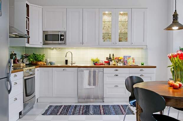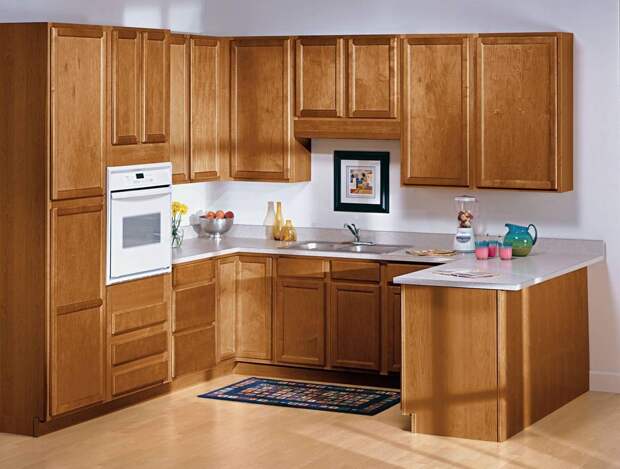 Поклонники дизайна кантри легко придадут обстановке на кухне нотки деревенского образа жизни. Стиль шейкер – модное новое направление. Для отделки подбирают светлые пастельные тона, натуральные материалы. Полы обшивают досками или ламинатом. В рабочей зоне уместно положить напольную матовую плитку, стены окрашивают белым цветом. Кухонный гарнитур из вишни и клена составляют из шкафов, столов простых лаконичных форм. Верхний ряд мебели отлично заменят открытые полки. Обеденную группу формируют деревянными стульями с мягкими сиденьями. В зоне отдыха можно поставить маленький диванчик. На полу размещают небольшие тканые коврики. Окна занавешивают скромными батистовыми, ситцевыми шторками.