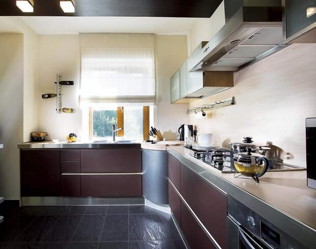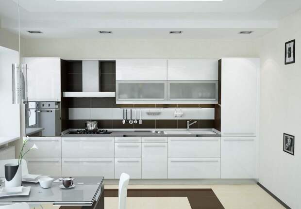 Динамичным жильцам понравится лаконичный стиль хай-тек в светлых оттенках. Отличительная черта интерьера – эффект простора и пустоты в помещении. Господствующие материалы – металл, пластик, стекло. Популярная цветовая гамма – оттенки белого, коричневого, серого. Кухонные зоны хранения устанавливают высотой до потолка или немного ниже. На фасадах мебели не устанавливают ручки. Хай-тек предполагает много света, поэтому оконный проем на кухне не занавешивают шторами. Удачная задумка – жалюзи или стекла со специальным покрытием, защищающим от обзора извне. Обеденная зона или барная стойка возле окна – прекрасная идея сочетать завтраки, обеды с обзором красот за окном.